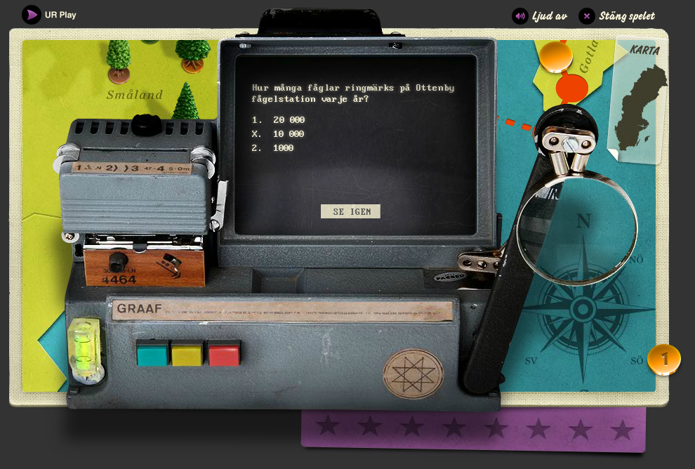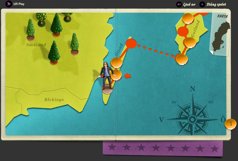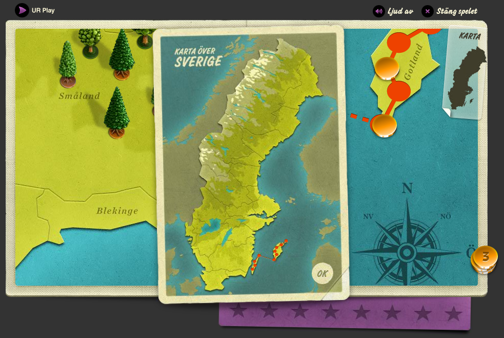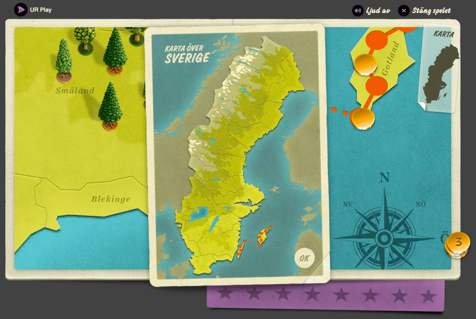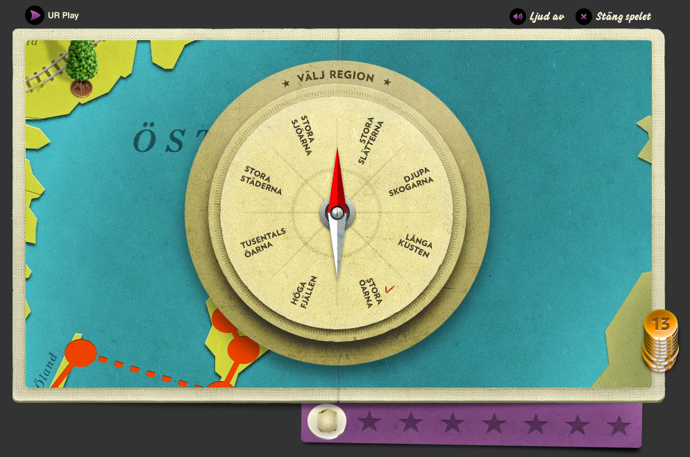 Sverigeresan – webbplats för åk 3 och uppåt. Uppdragsgivare: UR Uppdrag: konceptutveckling, projektledning, redaktörsjobb.Välj vilken region du vill resa i och lära dig mer om.Titta på klipp och bilder från regionen.Svara på frågorna i frågesporten och ta dig fram på spelplanen.Klicka på kartikonen för att få en översiktskarta över Sverige.När du fått tillräckligt många rätt i frågesporten, kan du lösa upp roliga bonusspel på vägen.