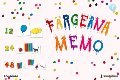 Färgerna memo – app. Uppdragsgivare: Rabén & Sjögren. Uppdrag: konceptutveckling, projektledning, redaktörsjobb. 4 av 5 i betyg för appen på pappasappar.se.Memot bygger på en bok av Pernilla Stalfelt. Välj hur många memobrickor du vill spela med.Varje gång du vänder en bricka, får du höra något om färgen på brickan, t ex ”rött som ett kärlekshjärta” och ”gul som solen”.Illustratör: Pernilla Stalfelt
